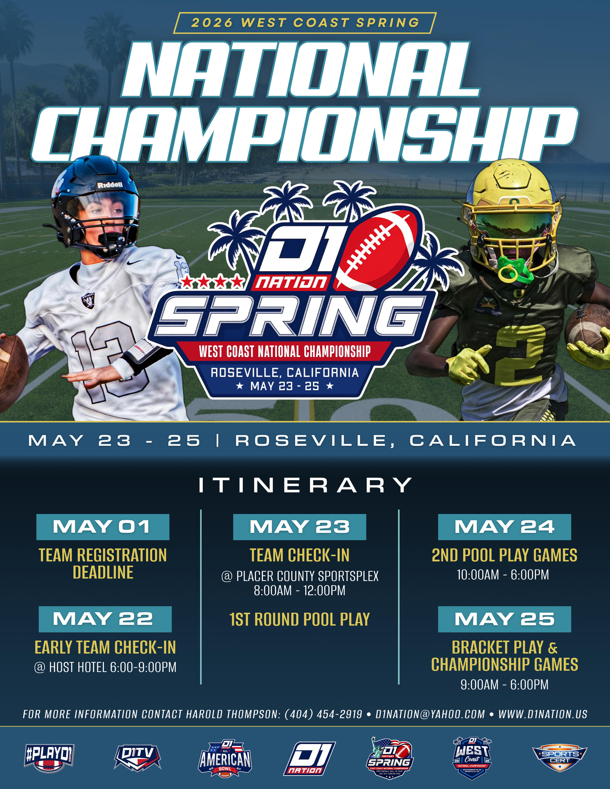 Click the button below to access our 2026 D1 Nation West Coast Spring National Championship registration form. There, you can register your team, provide team information, and contact details, and confirm participation. Once all information is complete, you’ll submit payment to officially secure your spot.